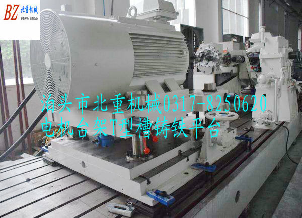 電機臺架T型槽鑄鐵平臺,T型槽鑄鐵平板工作面都加工有T型槽,中間距為200mm,一般用28t型螺絲,精度為2級。這樣的設計就是為了把電機定位在鑄鐵平臺上面,轉起來試驗,要得到數據等!
